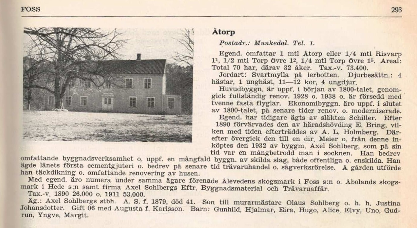 "Åtorp, gård uti Foss socken, Tunge härad af Göteborgs och Bohus län, med vackert läge vid Qvistrumselfven, ungefär 2’ mil från Uddevalla, består af ½ mtl