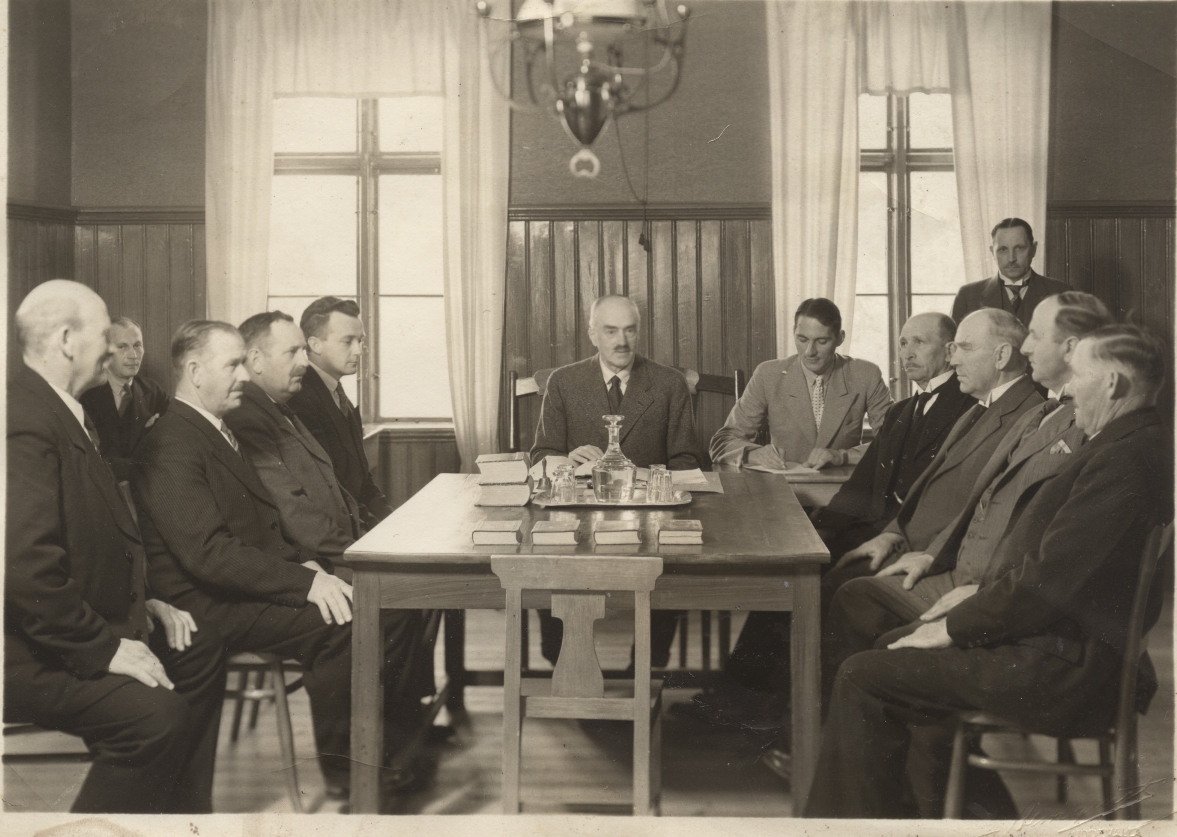 Nämndsammanträde vid tingsrätten på Kviström. Troligen i gamla tingshuset, således före 1917. Den enda vi med säkerhet vet är tredje mannen från vänster som är Karl Hansson frånTveten i Bro socken . Är det någon av våra läsare som kan berätta mera, kontakta redaktionen.