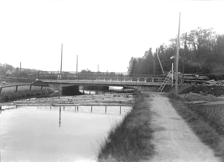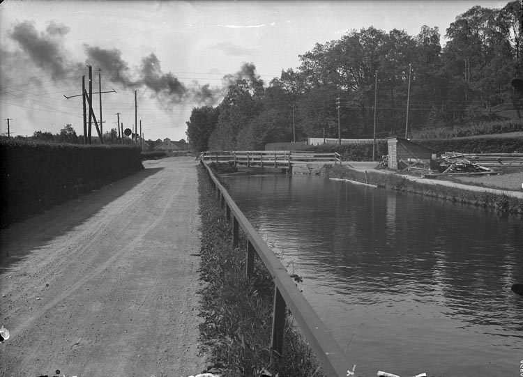Innan man hunnit bygga träbron var man också tvingad att bygga ny väg. Den första bron för landsvägen var byggd av trä. Varför den kallades för pumpebron är lite osäkert men av fotot att döma ser det ut som att det där fanns ett pumphus. Pumpen försåg Herrgården med vatten både till bostäder och ladugård. Dricksvattnet till bådadera ställen inklusive Föreläsningssalen/Fabriksskolan och kom från en källa benämnd laxhuset som låg ungefär mitt emot träbron ute på den åker som är mellan kanalen och Munkedalsälven.